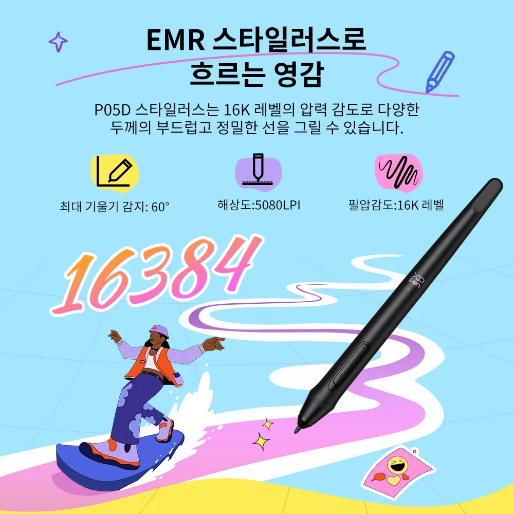 EMR P05D 스타일러스는 충전이 필요 없습니다. 16K 레벨의 압력 감도로 다양한 두께의 부드럽고 정밀한 선을 그릴 수 있습니다.
