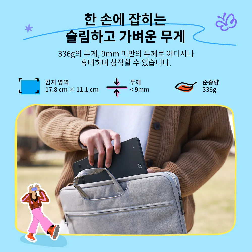 336g에 불과한 무게, 휴대폰만큼 얇은 9mm 미만의 두께. 가방에 쉽게 넣고 어디서나 창작을 시작할 수 있습니다.
