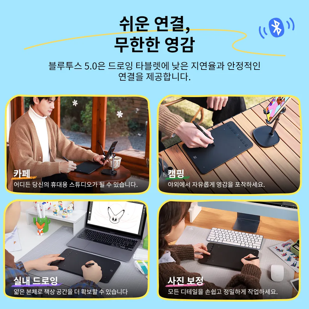 업그레이드된 블루투스 5.0으로 낮은 지연율과 높은 안정성으로 스마트폰, 태블릿, PC에 펜 타블렛을 연결할 수 있습니다. 복잡한 선 정리는 이제 그만하고 책상을 깔끔하게 유지하세요.