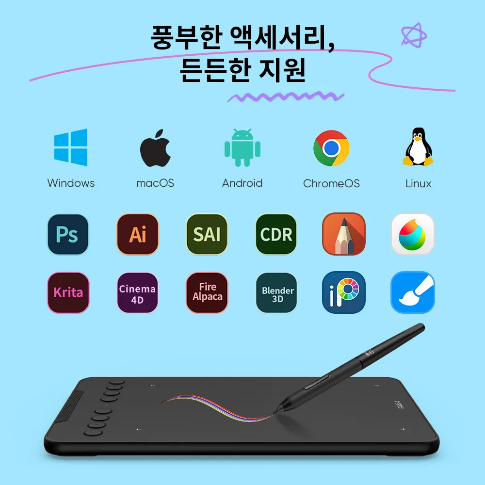 Adobe Photoshop, Illustrator, SAI, CDR, Clip Studio Paint, GIMP, Krita, MediBang, FireAlpaca, Toonboom, Maya, Blender3D 등 인기 있는 디지털 아트 소프트웨어와 호환됩니다.