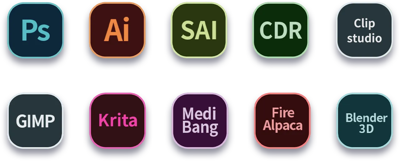 Photoshop, SAI, Painter, Illustrator, Clip Studio등과 같은 주요 소프트웨어에서도 호환 가능합니다.