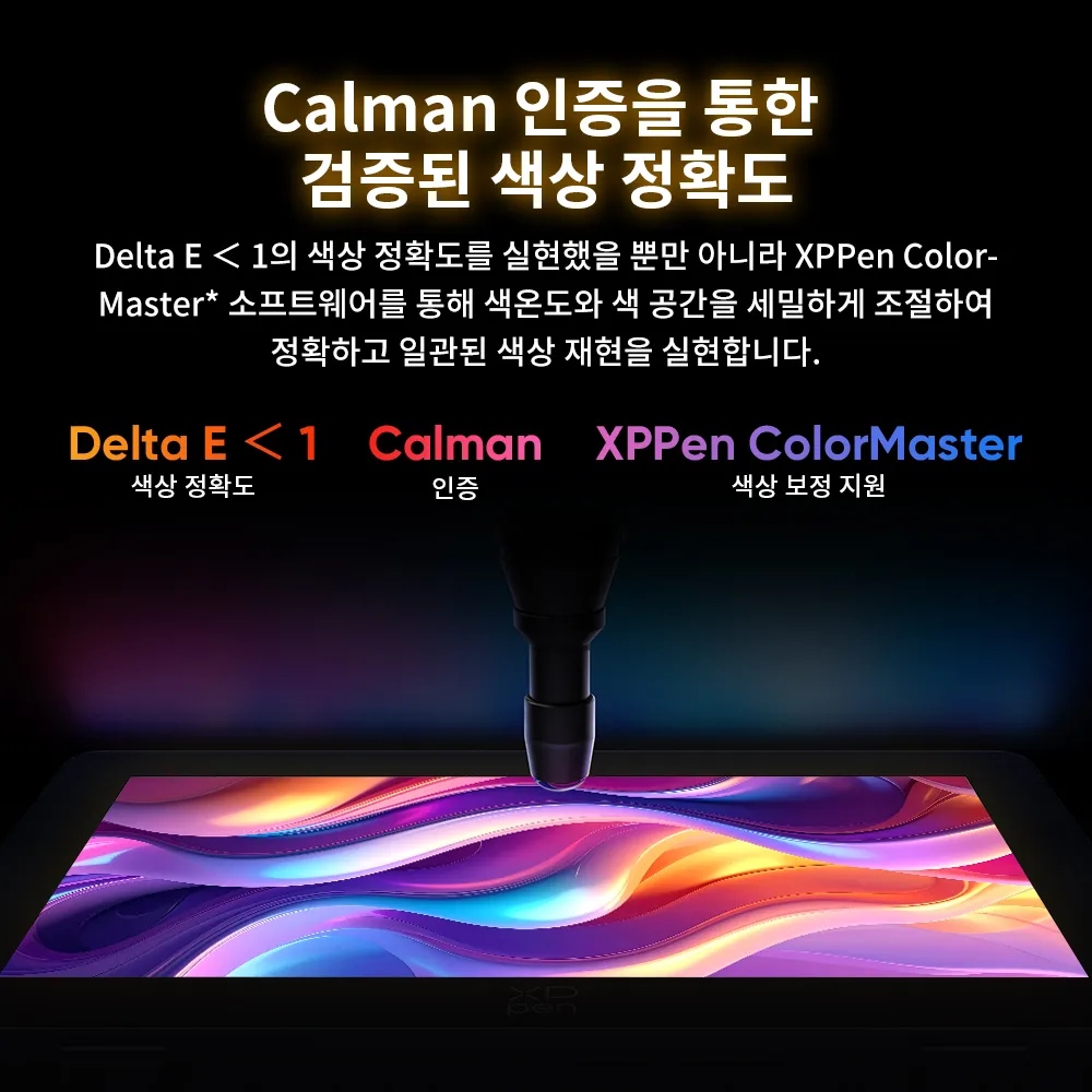 Delta E < 1은 창의적인 전문가의 엄격한 요구 사항을 충족합니다. Calman Verified 인증이 전문가급 품질을 보증하며 XPPen ColorMaster* 소프트웨어를 통해 색온도와 색 공간을 세밀하게 조절하여 정확하고 일관된 색상 재현을 실현합니다.