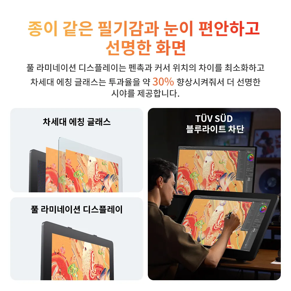 압도적인 색상 표현력을 갖춘 이 액정 타블렛으로 창작의 세계에 깊이 몰입할 수 있습니다.